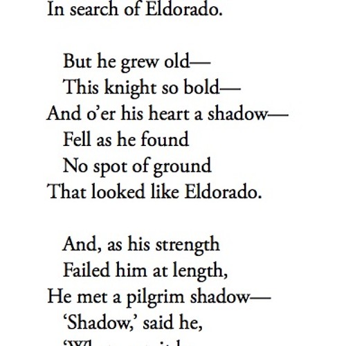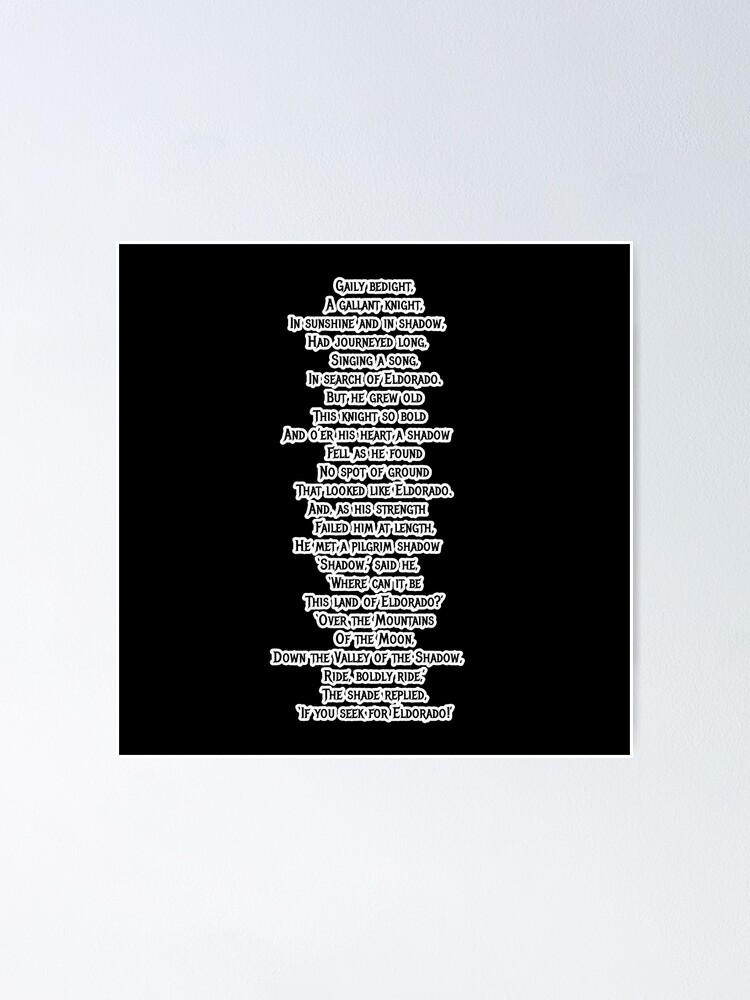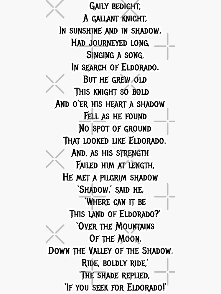 Eldorado (poem) - Wikipedia My Favorite Poems (Part Two) | Edgar allan poe, Poe, Eldorado poem Eldorado - Eldorado Poem by Edgar Allan Poe Ride, Boldly Ride…If You Seek for Eldorado” – Words, Books, and Other Magic POEM] Eldorado by Edgar Allan Poe : r/Poetry Eldorado Edgar Allan Poe