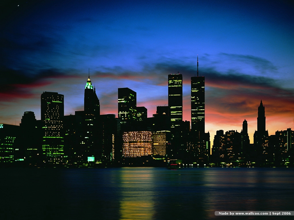 New York Skyline At Night Twin Towers